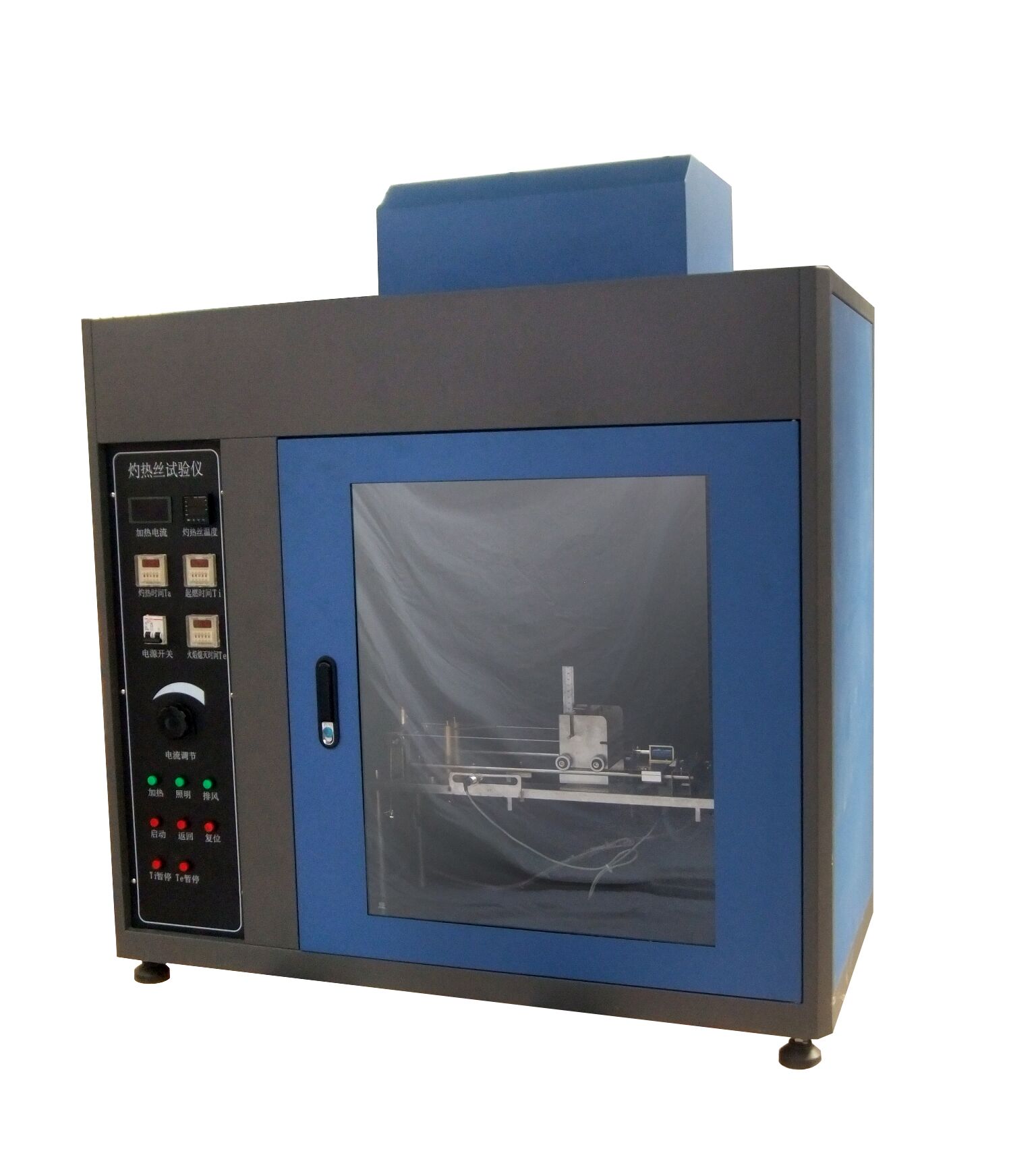灼熱絲試驗儀將規定材質(Ni80/Cr20)和形狀的電熱絲 (Φ4 mm的鎳鉻絲)用大電流加熱至試驗溫度 ( 550 ℃ ~ 960 ℃ 1mi后,以規定壓力 (1.0N) 垂直灼燙試品 30s ,視試品和鋪墊物是否起燃或持燃時間來測定電工電子設備成品的著火危險性;測定固體絕緣材料及其它固體可燃材料的起燃性、起燃溫度 (GWIT) 、可燃性和可燃性指數 (GWFI),也適用于絕緣材料、工程塑料或其它固體可燃材料行業