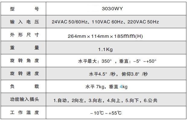 3030W室內壁裝全方位云臺選用優質電機。該云臺可直接固定攝像機及鏡頭,并可與小型護罩一起使用。云臺配有接插式安裝接線板,裝、拆方便。云臺本身配有安裝固定板,無須其它安裝支架。安裝操作方便,省去布線工作量,遙控距離空曠100米。