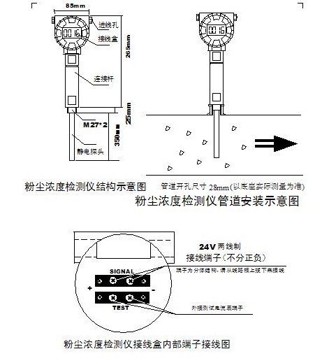 4 、接線盒內置一體化變送器輸出的4-20mA 電流與粉塵感應探針之間電氣隔離,實現信號的安全傳輸。